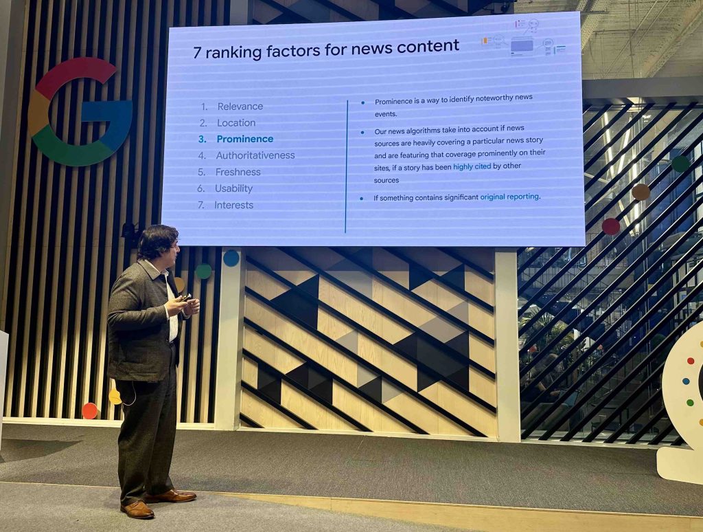 Before making the big announcement, Eric Barbera also showcased the different ways news and articles can rank across various modules, such as Top Stories, local news, or videos. He also highlighted the importance of having strong structured data, as well as the seven ranking factors for news content — useful to keep in mind, though nothing particularly new or that hadn’t been explained before. These factors are: relevance, location, prominence, authority, freshness, usability, and interests.