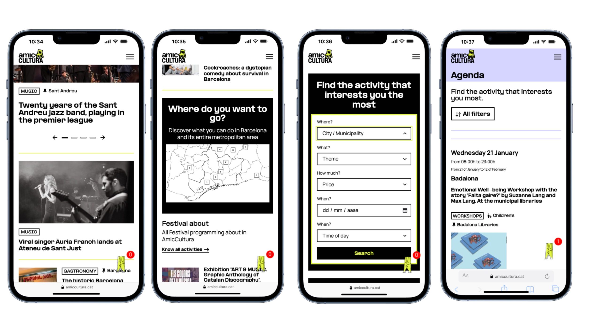 Diseño del producto para la promoción cultural del área metropolitana de Barcelona, creando un medio informativo y una agenda cultural en tres idiomas con recomendaciones personalizadas según el perfil del usuario basado en IA. Proyecto financiado con Fondos Next Generation para el Instituto de Cultura de Barcelona.